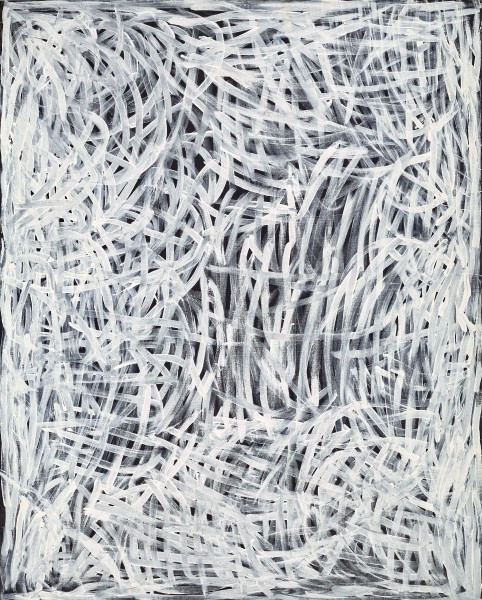 Untitled (Yam), 1996 is one of those remarkable late paintings – a masterpiece of strength and simplicity. The single colour, in this case a bright white, is applied lightly with a translucent quality in web-like traceries spread energetically across the canvas limited only by the reach of the artist’s arm. The sweeping arcs of white paint intersecting, overlaying and crossing in a series of gestural strokes mirror the subject of her painting – the meandering rhizomatic roots of the Arlatyeye plant (the pencil yam - Vigna lanceolata) and the cracks that form in the ground when the pencil yam ripens – while at the same time highlighting the intimate process between artist and canvas.