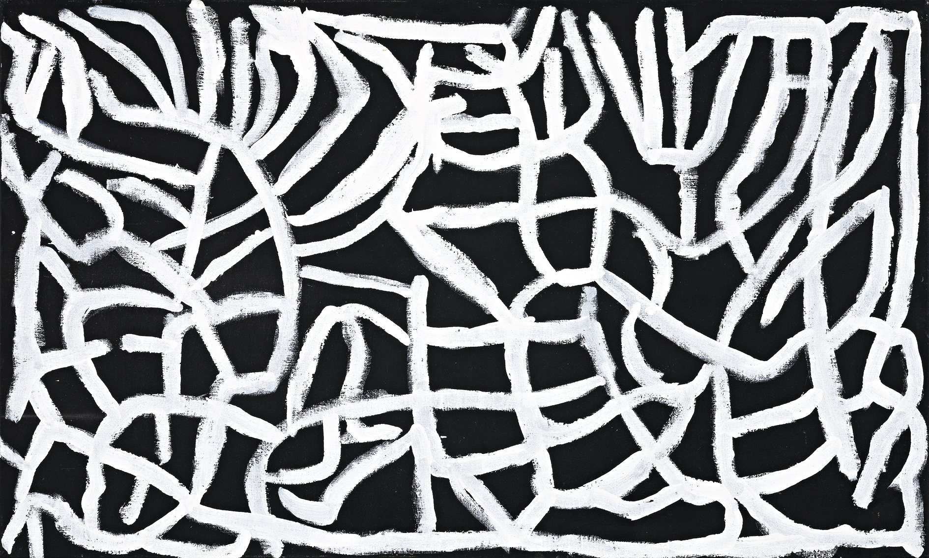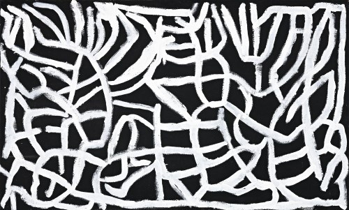 Within Emily's vision across this early 'lined' painting, is the yam increase centres linking an underground network from which growth will erupt and transform the landscape. This network is also viewed on the ground's surface, showing where yams lie ready for harvesting.