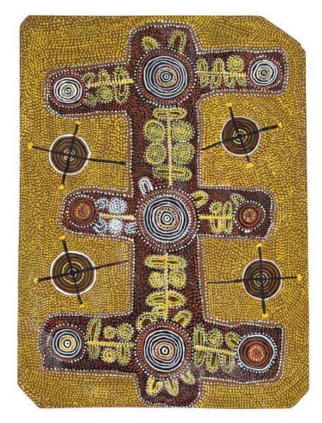 There are recurring themes in the art of Uta Uta Tjangala and the best known of these relate to Yumari, a rockhole and important ancestral site in his mother's country. This early depiction attributed to the artist was painted at Papunya in the later months of 1972, shortly after Geoff Bardon’s departure. A sacred site located in between the communities of Walungurru (Kintore) and Kiwirrkura across the border in Western Australia, Yumari had personal significance for the artist. He was the custodian of this site which is linked to his conception place at Ngurrapalangu through the story of Yina, the ancestral travelling Old Man. His father is buried in the area and it is a place he regarded as home in the sense of the Aboriginal connection to country – Yumari was integral to Tjangala’s personal identity.1