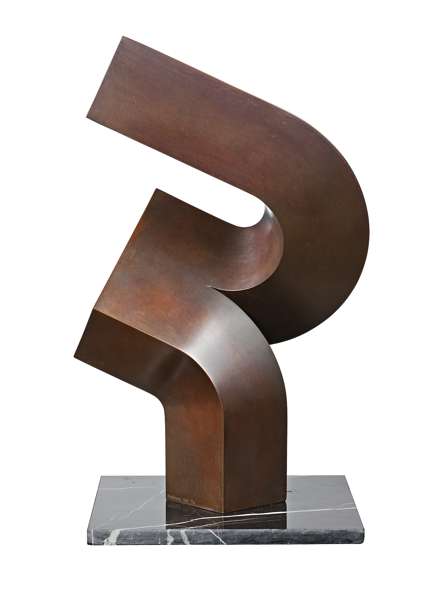 The power in Clement Meadmore’s sculpture resides in the intriguing paradox it presents to the viewer. It is at once a fixed and solid form yet also a gestural force pushing into space and rearranging it in a dynamic fluid movement. His work emanates a robust physicality and yet an ethereal quality is equally evident. The ideas his sculpture embody tip between gravitas and whimsy, so often seen in Meadmore’s irreverent play on words with titles such as Upstart, Fling and in the case of this piece, Upswing, 1980. In fact, while we first turn our minds to monumental archetypes when considering his work, many of Meadmore’s conceptions are born from jazz, which was a constant muse in his studio while he worked. The monumental Upswing in the Miami garden of Mr and Mrs Leonard Luria latently refers to jazz improvisations and may well have its genesis in musical notations. It is one of the more gestural examples of his work, playfully moving a solid form up into space, seemingly counter to the laws of gravity.