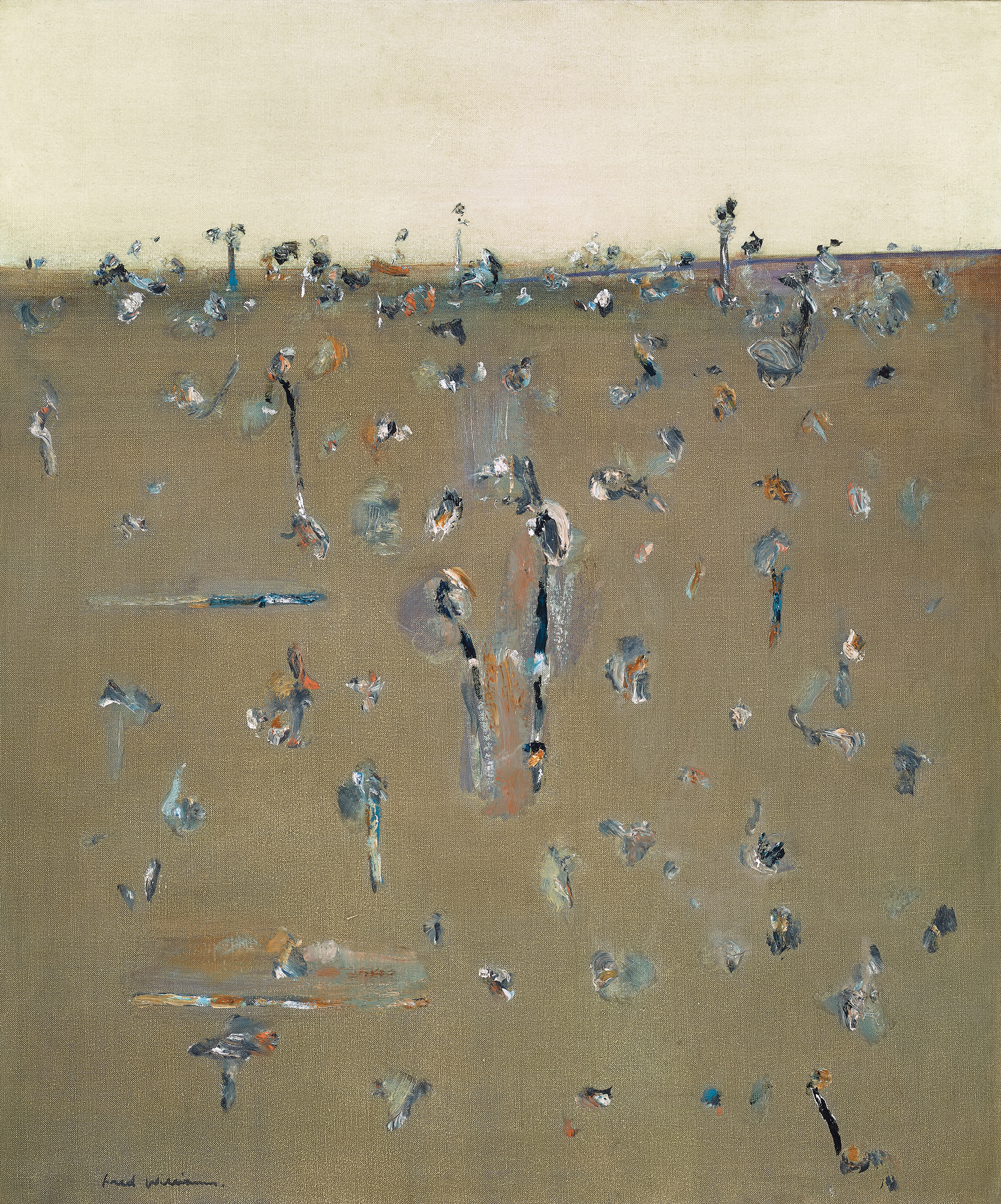Works with single demarcated elements such as a high horizon line reoccur. Skies are an infinite space and the landscape below is vast and contained within the artist’s imagination and his deft, painterly control. The surface becomes an expanse for Williams’ distinctive minimal forms and flecked intonations, where the immediacy of painting never allows for any gesture to be repeated. All the while they suggest the unpatterned irregularity of something observed and formed into an astonishing work of art in the studio.