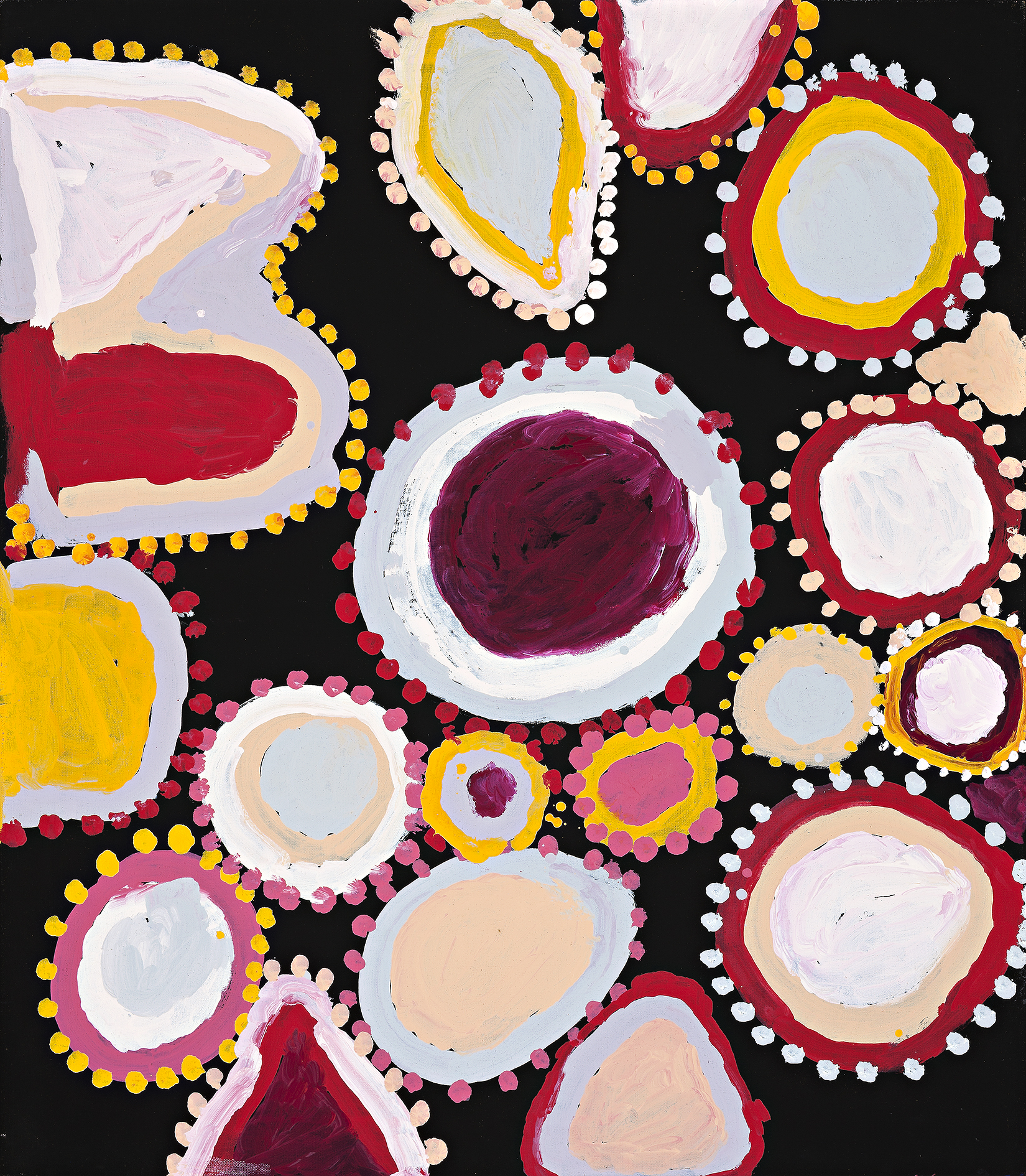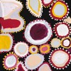 This work is accompanied by a certificate from Ninuku Arts which states: ‘This painting depicts the various bush tucker that is found around the artist’s country close to Victory Downs in the Northern Territory in Yankunytjatjara country. Lots of women were at this site collecting kampurarpa (bush tomatoes) and wayanu (quandong). A man came along and asked the women for the mai (food) but the women didn’t give any to him. So the man had no mai. After that the man left and the women fed all the mai to the tjitji (children) and the children were full-up. The man came back again and the group went together to Pangkupiri which is near Tjukula and close to the artist’s mother’s country. The various shapes in this painting represent the bush tucker found at this site.’