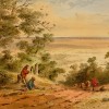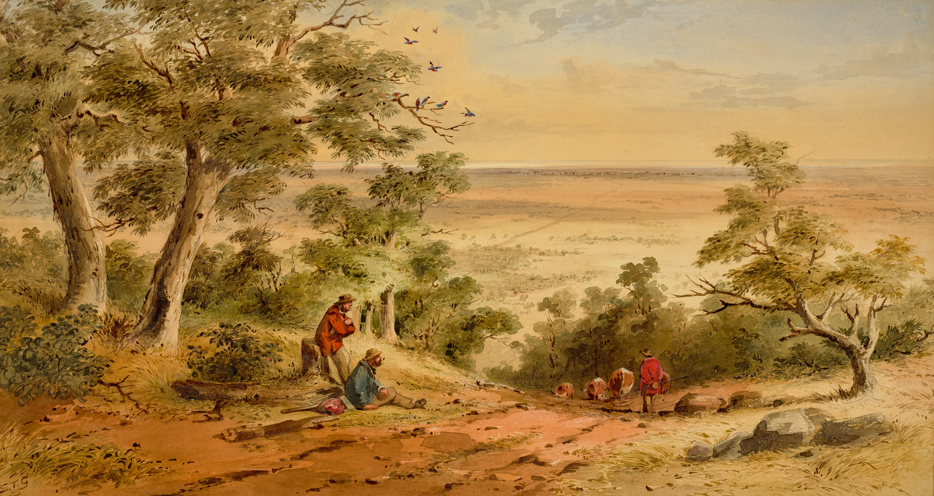 This imposing watercolour is among the largest of Gill’s paintings, the wide sheet allowing him to depict the expansive view from the Mt Lofty Ranges, looking north to the distant city of Adelaide. We see Gill’s attention to detail in feathery leaves and textured bark of the gum trees that frame the steep descent, down which the plodding cattle disappear. The vibrant colours of the men’s shirts contrast with the pastel colours beyond, the changing tones of the sun-lit and cloud-shaded expanse of the plains below leading to the silver-lined horizon of the waters of the St Vincent Gulf. Gill often did not date his paintings; instead, his initialled signature evolved over the years.2 The flourishing tail of the G seen here suggests that this watercolour was painted after he had departed South Australia for Victoria in 1852, and thus would have been based upon sketches that he took with him. Its size may indicate that it was done by commission, as with his series depicting Prospect House, Adelaide, 1850 which are of a similarly grand scale.3 An earlier, looser watercolour Adelaide Plains from the road to Government Farm, 1842, shows a different aspect of the winding road to Belair, formerly the site of the government farm and the governor’s summer residence, and now the Belair National Park.4