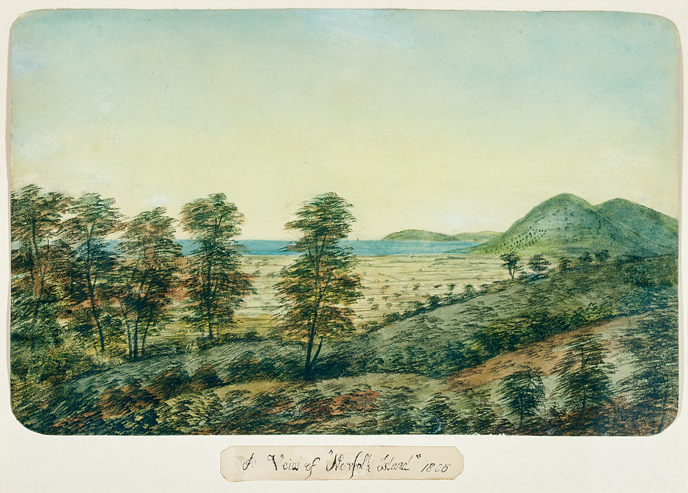 dated and inscribed with title lower centre on mount: A View of ‘Norfolk Island’ 1805