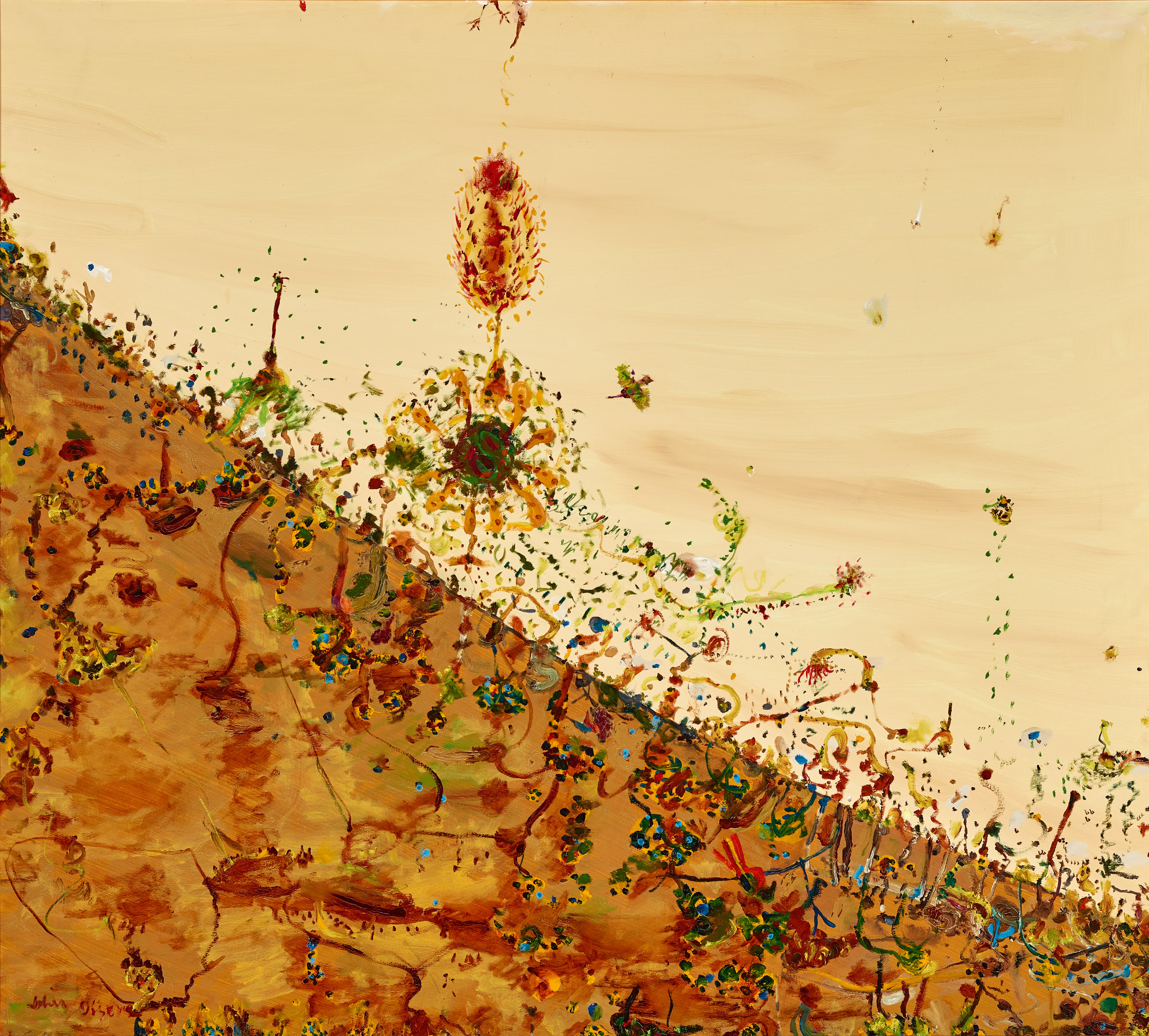 A small town about thirty kilometres from Adelaide, Clarendon was Olsen’s home for the next seven years and its picturesque beauty would be a constant inspiration for his art, giving rise to such joyous paintings as Golden Summer, Clarendon, 1983 (Art Gallery of New South Wales) and Clarendon Spring, Make Sure the Sun Wipes its Feet, 1984 (Broken Hill City Gallery). In 1985 Olsen was awarded the Wynne Prize for landscape painting for A Road to Clarendon: Autumn, 1985, this very public accolade confirming the brilliance and wide appeal of these paintings. The accolades have of course continued – from the recent 2005 Archibald Prize win, to the retrospective exhibition shown in Melbourne and Sydney in 2016-17 – throughout a career that has now spanned more than seven decades and which sees Olsen rightly hailed as Australia’s greatest living artist.
