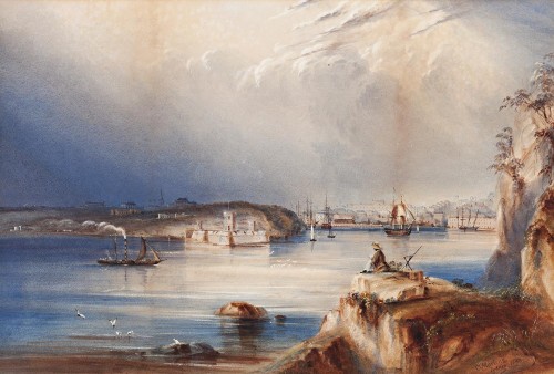 Apart from its intrinsic quality as one of Martens’ best works done at a time when his career was blossoming, this work has an impeccable provenance. As recorded in Martens’ account book in an entry which gives its title as ‘View of Sydney Cove’ dated 22 November 1838, it was acquired for fifteen guineas (Martens’ highest price at the time for a large work) by the Scottish merchant John Gilchrist (1803 – 1866) who had been based in Sydney since 1828. Like others involved in the local shipping trade, he lived at first at Millers Point. After his marriage he built Greenknowe at Darlinghurst (now Potts Point) in the mid-1840s and lived there with his family until returning to England in 1854.