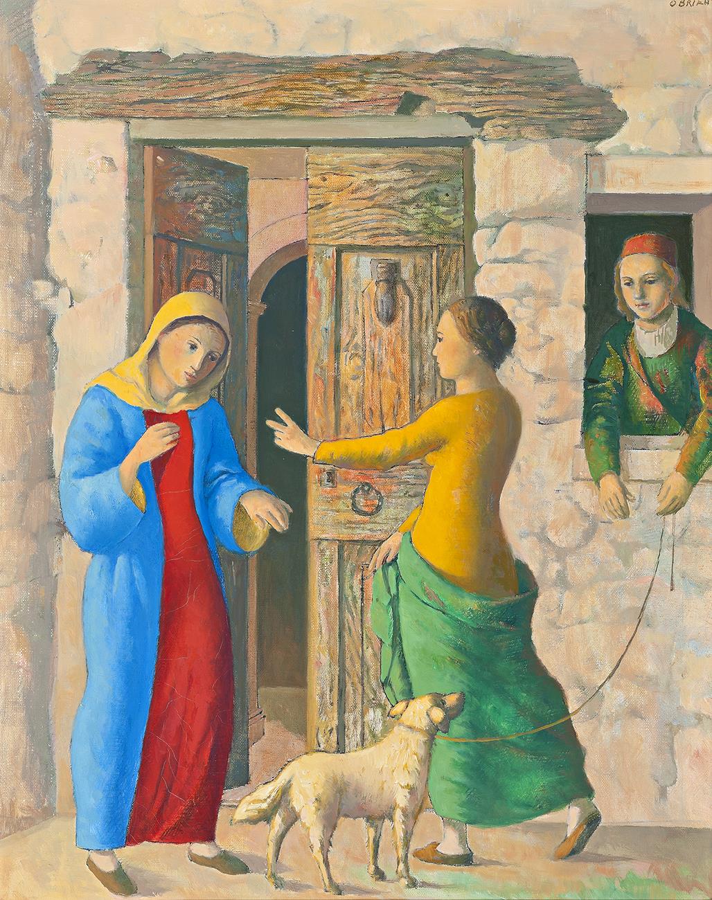 The Visitation, is a moment of quiet grace and shared personal joy. Painted in an urban setting, the meeting occurring at the doorstep of Elizabeth and Zacharias’ house, assuming O’Brien was literal in his reading of scripture. Mary, dressed in symbolic blue and red garments, appears concerned and afraid, bowing in deference to her older cousin, who gestures to welcome her into her home. O’Brien had an astounding depth of knowledge in art history, particularly in the Flemish and Italian Renaissance, and used his understanding to aliment his compositions. This Visitation bears strong stylistic similarities to Albrecht Dürer’s woodcut of the same scene, from which O’Brien appropriated Zacharias’ figure in the doorway (here at the windowsill) and what is believed to be Dürer’s own dog in the foreground.