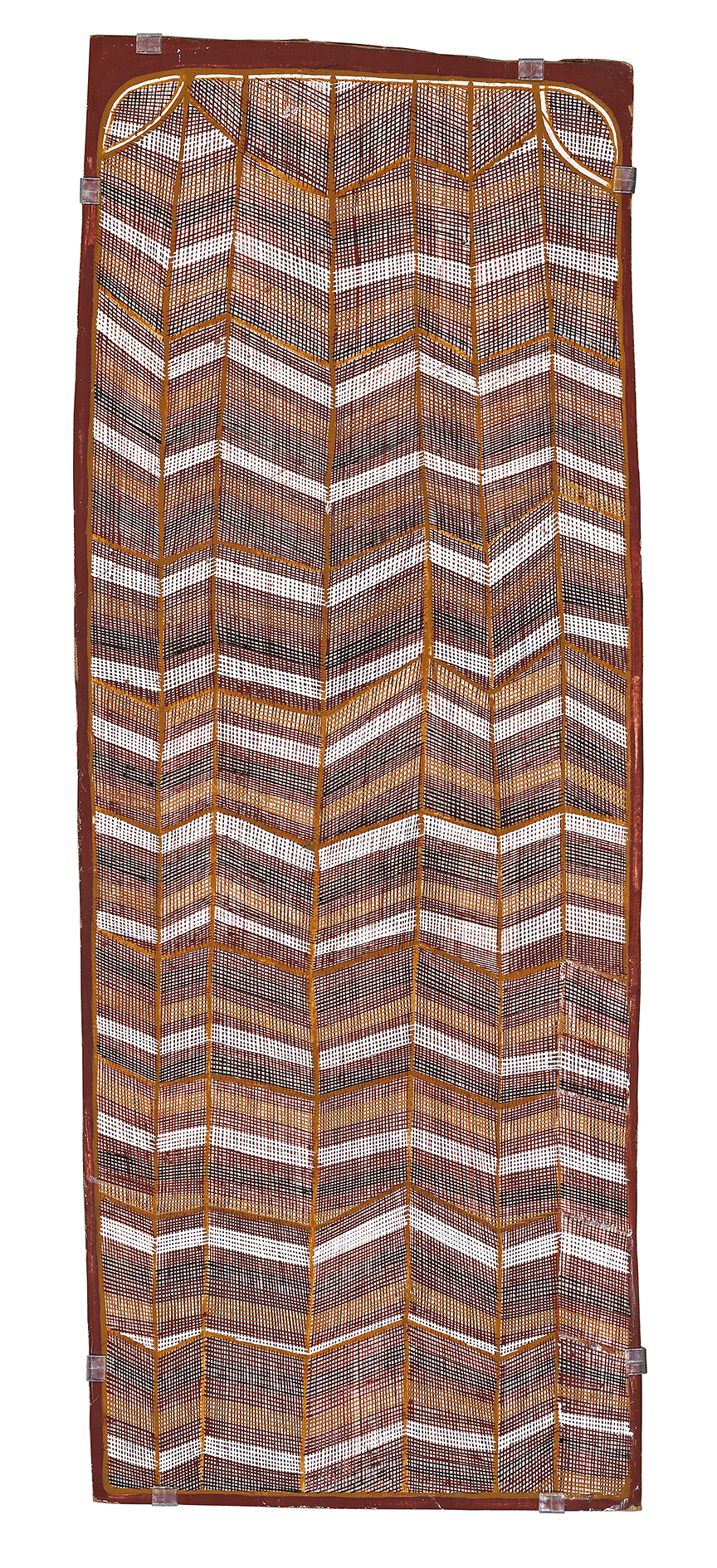 This work is accompanied by a certificate from Maningrida Arts and Culture which states: ‘In this painting Njiminjuma has depicted a sacred site at Kurrurldul, his outstation south of Maningrida. The Rarrk, or abstract cross hatching, on this work represents the design for the crow totem ancestor called Djimarr. Today this being exists in the form of a rock which is permanently submerged at the bottom of Kurrurldul Creek. The imagery represents the crow in three different domains. Most simply it is the black crow wak and the ancestral form of this bird called djimarr. At the same time, the image represents the rock mentioned above, which is the final transmutation of the dreaming ancestor djimarr. Finally, the pattern used here is also the crow design used in the sacred Mardayin ceremony which is a large regional patrimoiety ceremony now rarely conducted in central and eastern Arnhem Land.’