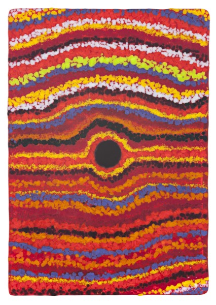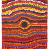 ‘Helicopter has depicted some of his traditional country, which is located far to the south west of Balgo, in the Great Sandy Desert. This country is known as Wankartu, named for the tjurru or soakwater that is featured in the centre of the painting. It was in this country that Helicopter was born, and travelled and hunted as a young man with his family. The remaining lines depict the tali, or sand dunes which dominate the landscape of the area.’