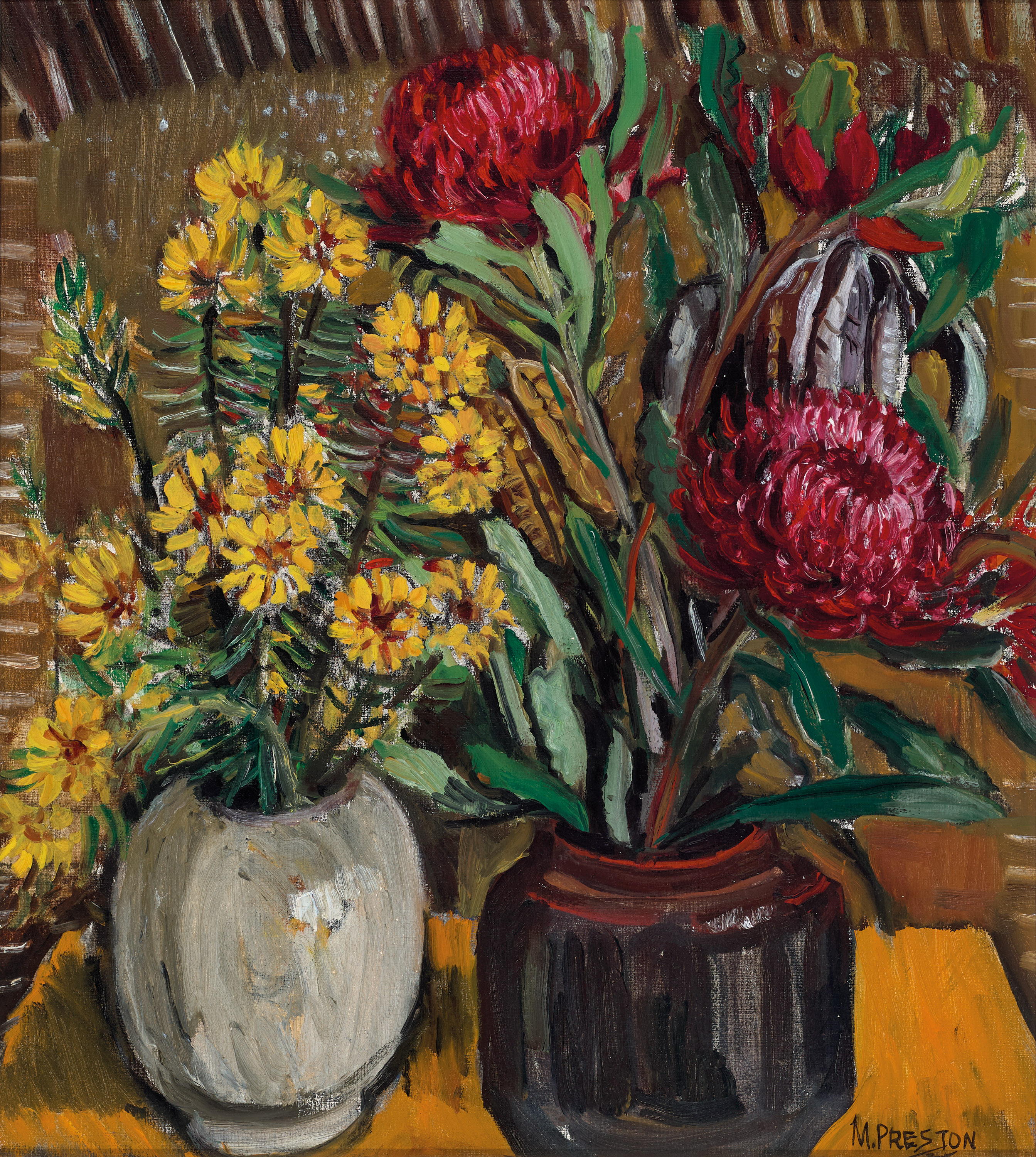 Preston’s passion for Australian native flora was such that it is somewhat surprising how rarely the waratah appears in her work, given that it is the State emblem for New South Wales. Apart from a handful of prints, she usually used the scarlet bloom as an accent within other mixed still lifes, making Waratahs and Wildflowers, 1955, significant for its painterly focus. Here, the clutch of waratahs is balanced by a bunch of yellow Pultenaea stipularis (commonly known as handsome bush-pea), each lot in their own vase, drawn from the artist’s personal collection of ceramics (both vases also appear in other Preston paintings from that year).2 Waratahs and Wildflowers was painted at Preston’s home studio in Killarney Street, Mosman, and she sourced the native flowers ‘from florists, or was given specimens by her friend T. G. B. Osborn, Professor of Botany at Sydney University.’3 Set upon a plain timber table, the flowers have as their backdrop a bold pattern inspired by the artist’s extensive knowledge of Indigenous motifs and symbols. Executed in earth colours, this staging presents an ‘authenticity’ for the presentation as a whole. Preston had first advocated the fine art qualities of Indigenous art in an article for Art in Australia in 1925 and many more essays followed.4 She consulted with museum officials, organised exhibitions, travelled extensively to remote rock art shelters and lectured widely on the subject. Her acts of appropriation regarding the original artists and their artworks have been criticised, but Preston acted with integrity within her chosen boundaries and undeniably widened the appreciation for Indigenous art in Australia.