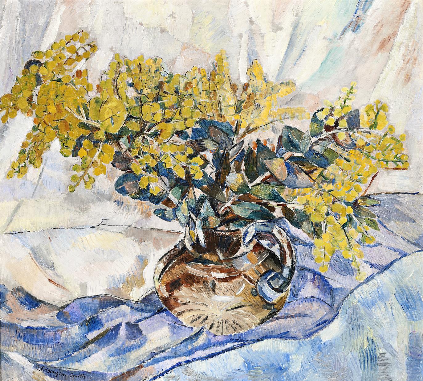 Cossington Smith’s patriotism was long standing, exemplified in such paintings as The Sock Knitter, 1915 (the artist’s sister Madge knitting socks for the Australian troops in the First World War) in the collection of the Art Gallery of New South Wales, Sydney and Dawn Landing, 1944 in the Cruthers Collection of Women’s Art, The University of Western Australia, Perth. Harbinger of spring and yellow, the artist’s favourite colour, wattle features in some of her finest flower paintings as Drapery with Wattle, c.1944 (private collection) and Drapery and Wattle, 1952 (Art Gallery of New South Wales, Sydney). During a recorded interview with Hazel de Berg in 1965, Cossington Smith said: ‘My chief interest, I think, has always been colour, but not flat crude colour, it must be colour within colour, it has to shine; light must be in it…‘. She continued ‘… Australian wildflowers are quite on their own, they are the most lovely things that we have and their colour is not what you’d call brilliant but it is a soft brilliant colour like our atmosphere, which is very wonderful’.2