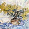 Wattle is a characteristic painting of its time, the compositional high viewpoint centring on the vase, around which the flowers and drapery revolve. This ceaseless movement is shared with other still life paintings of the period, from Wildflowers, c.1940 (Art Gallery of New South Wales)3 through Wildflowers in a Glass, c.1943 (Deutscher and Hackett, 28 April 2010, lot 32) to Drapery with Wattle, c.1944 (private collection). An affinity between the latter painting and ours continues in the view of the containing jugs and sweep of flowers, the dynamic play of light in vibrant colour and separate, textured brushstrokes. Alive with colour and movement, Cossington Smith’s still life paintings are anything but still. Moreover, the transforming play of light recalls mosaics, the small pieces of coloured glass and stone set at angles to catch and reflect the light giving a shimmering radiance and luminous quality evoking the transcendental. So it is with Wattle, for Cossington Smith’s art is the expression of beauty and ‘… things unseen – the golden thread running through time’.4