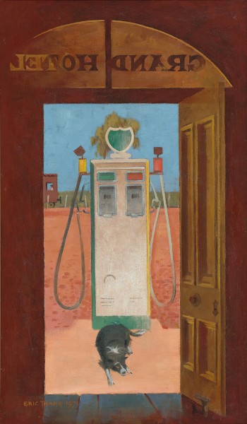 Thake always takes us further than first impressions. There is an hot eerie stillness in The weekly train departs… It is not simply an evocative moment of nostalgia: a (then) modern petrol stand is front and centre. It alludes to some kind of unexplained certainty despite the haunting absence of people. The viewpoint of the artist in a standoff with his subject is all we are given. And the dog couldn’t care less. Or as Steven Miller as describes it, ‘the petrol pump… appears to have metamorphosed into a woman: in 1971, women were not permitted in the public bars of Australian hotels, but this one is clearly unstoppable.5