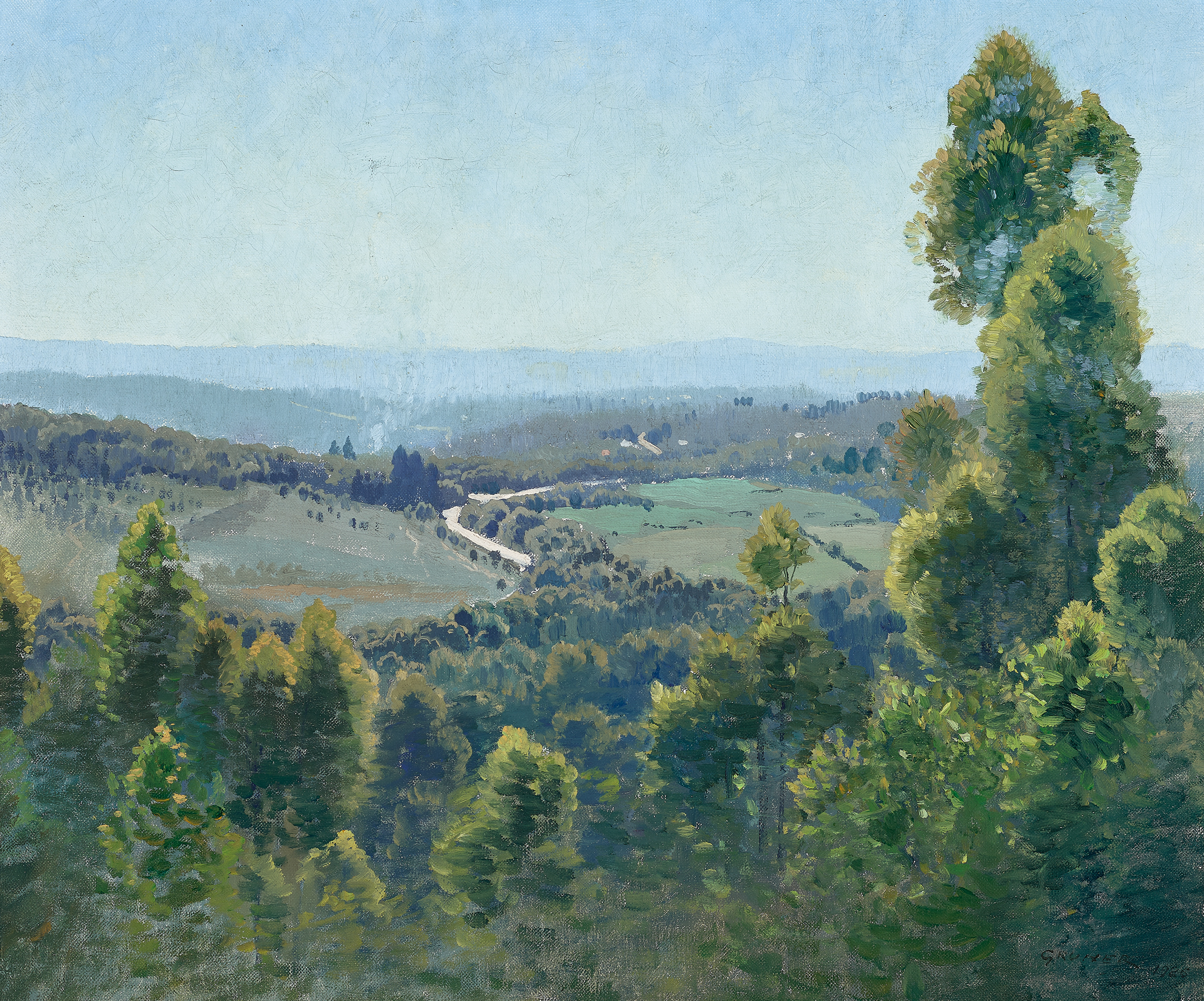 After his return to Australia in 1925, his subsequent paintings put a new emphasis ‘on structure, pattern and rhythm of forms in the landscape.’2 The White Road, Mt. Lofty, South Australia, 1926, is one of these and gallery audiences immediately responded when Gruner exhibited the new works at the Macquarie Galleries in Sydney in August 1926, with the result that the show was almost sold out in two days. In the previous months, he had travelled extensively though the countryside, mostly alone and camping out, often staying for days in a chosen location, studying and sketching it from many angles. Towards the end of 1925, he took an extended journey to Adelaide, staying in ‘in secluded circumstance,’3 where he painted The White Road, Mt. Lofty, South Australia. The vista is located near to the city and Gruner worked en plein air over some days, using the white road itself as the centre-anchoring motif. The influence of Cézanne in the foreground is pronounced through the individual strokes of colour as Gruner seeks to delineate each leaf in the trees, creating the ‘insinuation of an unseen thing… the wind… advancing over a forested valley. The strong leaves sprang backwards and forward as if controlled by steel springs, while the young ones fluttered in millions so far as the eye was able to see.’4 The painting’s original, exhibited title was ‘October morning’, suggesting this was the month when the work was initially completed before he left the location. However, the 1926 signature and date indicates that he must have worked on it again at a later stage before finishing.