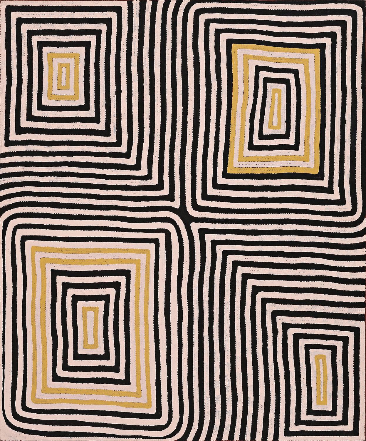 Tjampitjinpa’s later paintings are reductive and vivid, optical works that pulsate with energy and this distinctive aesthetic is exemplified by Wilkinkarra (Lake MacKay), 1993. In this painting, Tjampitjinpa has taken a square, one element of his visual lexicon, and enlarged and repeated it over and over in alternate colours, creating four monumental forms. These squares don’t sit together in balance; rather, they push and twist against one another creating tension and energy. Each upscaled geometric element, representing one part of the Tingari story, is the product of two decades of refinement by the artist in charting the vast terrain of the Western Desert in his own deft visual language. The related story is part of the Tingari cycle and tells that in mythological times a large snake travelled to the area and created Wilkinkarra (Lake Mackay), which became its home. In an area on the east side of the lake, two men set a fire which burned out the lake, and when the snake found himself with a bushfire sweeping upon him and was severely burned he fled, eventually settling at his final resting place near Jupiter well further west.2