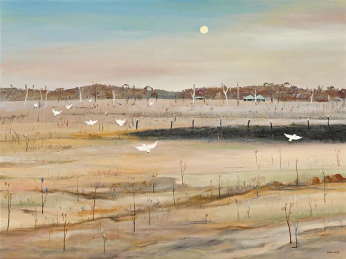 Arthur Boyd first visited the Wimmera in north-west Victoria in the summer of 1948 – 1949. His paintings of the wheat-growing region, particularly those based around Horsham and Ararat, met with both critical and popular acclaim when exhibited in 1950, and their success led directly to his inclusion as one of Australia’s representatives in the 1958 Venice Biennale. Boyd revisited the theme on occasion over the following decades, painting at his property Riversdale in southern New South Wales, or at the households he established in Britain and Italy. Such was the impact of the Wimmera on his psyche that ‘every house was his studio, and the Australian landscape, strongly held in memory, was as accessible to him in his Suffolk Studio as anywhere else’.4 In Wimmera Landscape with Full Moon and Nine Cockatoos, c.1985, Boyd presents a familiar vision but one set at an unfamiliar time, namely early evening when the sky is still blue and the full moon is already prominently visible. The lights in distant houses beckon and a squall of cockatoos – the Wimmera’s most ubiquitous bird – are screeching past, catching insects for their dinner. In the middle distance, a fire-scorched patch of pasture offsets the soft green of the foreground and the scattering of pink and blue spiky plants. For the painting’s previous owner in London, such an immediately recognisable landscape would have been a source of continuing delight, memory and tangible connection to Australia.