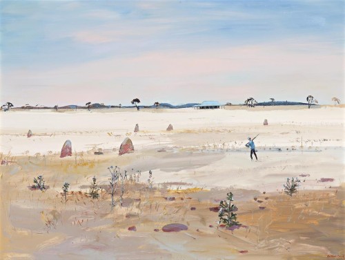 Boyd first visited the arid location in the summer of 1948 – 49, painting at the border of the Wimmera River. Over the next few years, he also visited the old mining sites near Mt William and around Bendigo. Boyd was struck by the Wimmera’s luminous sky and was also drawn to the visible scars of human presence left in the land, in particular the residue from the 1850s gold rush, still visible a century later. ‘Diggers and gold escorts from South Australia made their way through the Wimmera (and) many Chinese came this way to evade the entry tax imposed on all Chinese at Victorian ports … By the 1870s the Wimmera was swarming with selectors, many of them ex-miners. The golden age of wheat had commenced and would continue long after the gold had run out in other areas.2 One such souvenir still dotted through this former mining landscape is the compacted piles of rock and dirt known as mulloch heaps, left over from miners digging for gold. Boyd painted these mounds and scattered boulders earlier in Old Mining Country Near Bendigo, 1951, and Mining Country, c.1952, then over time, morphed them into pronounced anthill-like formations. Such nests are not actually a feature of the Wimmera though this has led to some related versions being mis-identified with titles such as Landscape with Anthills, n.d., and Anthills and Cockatoos in the Wimmera, c.1986. As ever, Boyd includes a human or animal presence in the otherwise sparse scene, such as the hunter and homestead featured here, thus providing his Wimmera paintings with ‘a sense of acceptance that many country dwelling Australians could identify with readily’.3