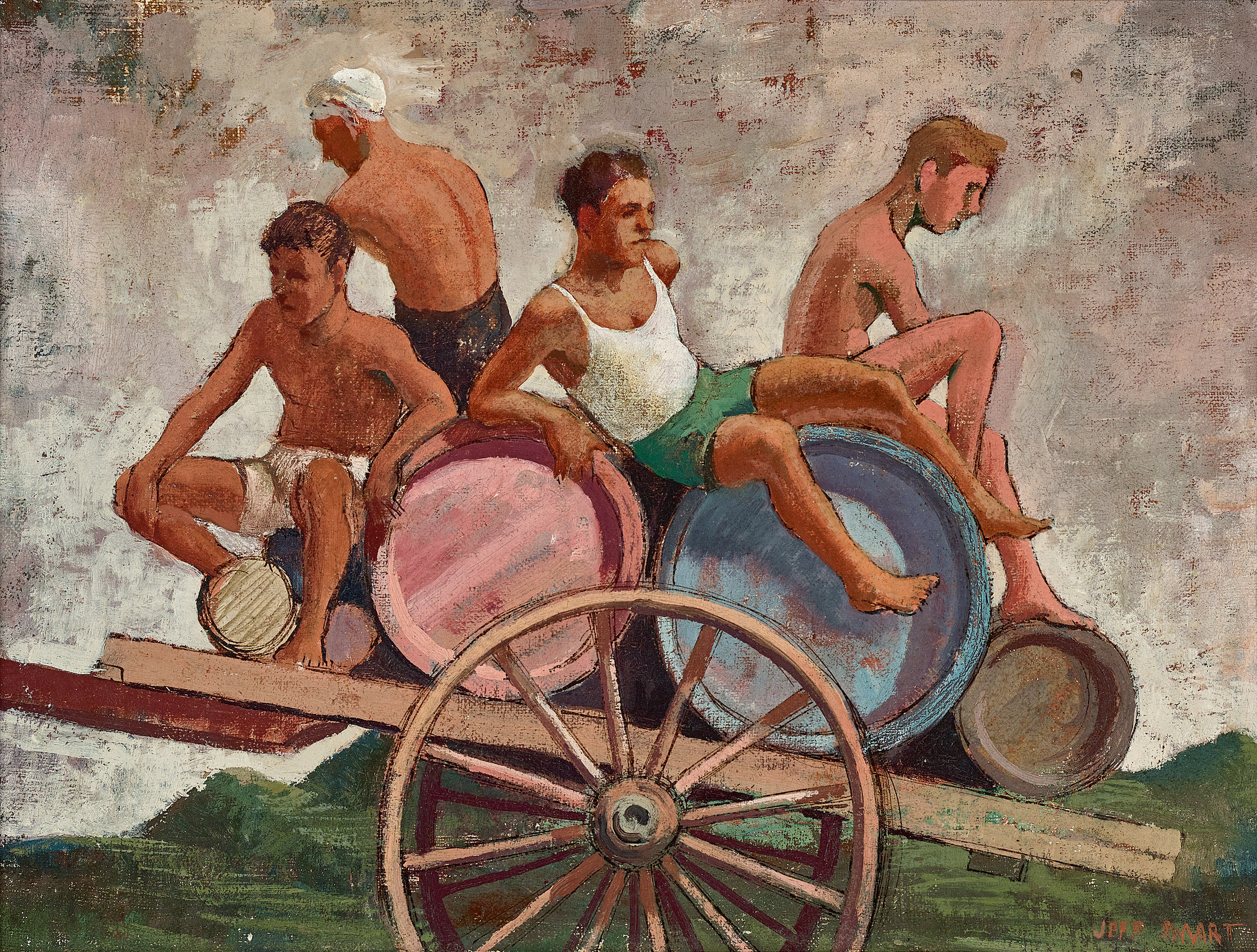 Under a scumbled pale purple and grey sky, Jeffrey Smart’s Italian wine carriers rest their weary and suntanned bodies in a precarious balance atop barrels of locally produced wine, trundling back to the village via horse-drawn cart. Although Smart spent more than a year on the island of Ischia, off the coast of Naples between 1948–50, he painted no more than a handful of works there, finding it easier to work on paper in ink and watercolour. The origins of this painting are, in fact, found in an ink sketch from 1949, called Wine Labourers and Cart, in which we can see the barrels of famous Epomeo wine from Ischia were thankfully tied securely to the cart with a rope.