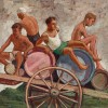 Warm and textured, Wine Carriers, 1950 is a carefully crafted and dramatic study of some of the young men with whom Smart shared the island. The dynamic composition of stacked circles and diagonal directing lines demonstrates the crystallisation of one of Smart’s most enduring compositional devices: the contrast of geometric structures with human figures. These men appear resigned to a life of harsh physical labour in a landscape whose sparseness is poignantly described by a low horizon and a vast, pale, featureless sky. Donald Friend, who also responded enthusiastically to the island’s attractions and joined the motley group of expatriate aesthetes, wrote of this scenery in his diaries in December 1949: ‘the setting has been unrelievedly idyllic … bleached pink and white villages in clear pale sparkling sunlight, under a pale pure sky, the air warm, dry, sharp, invigorating … and through hilly country where innumerable farms and vineyards are enclosed in rough pale grey and white stone walls ... and behind reared the jumbled crags and precipices of wild mountains and hills so patterned and textures with terraces of vineyards ... that they took on the appearance of giant fingerprints.’1
