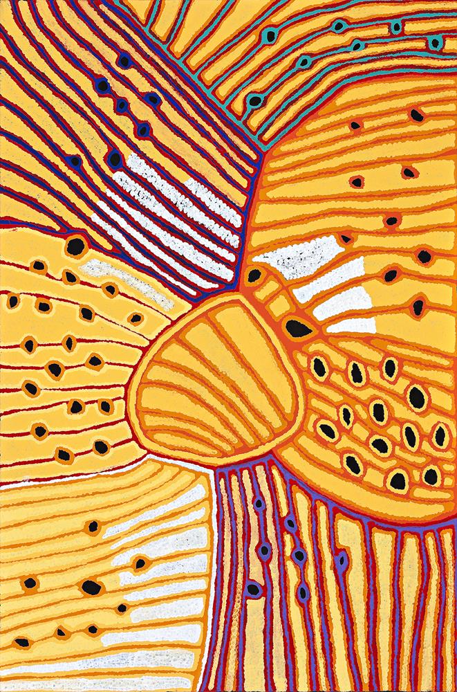 This work is accompanied by a certificate of authenticity from Short Street Gallery that states: ‘The middle of this painting is Winpa country, all the lines are tali (sandhills) and white parts are salt lakes. This shows all the jila (waterholes) that Winpa left when he died.’