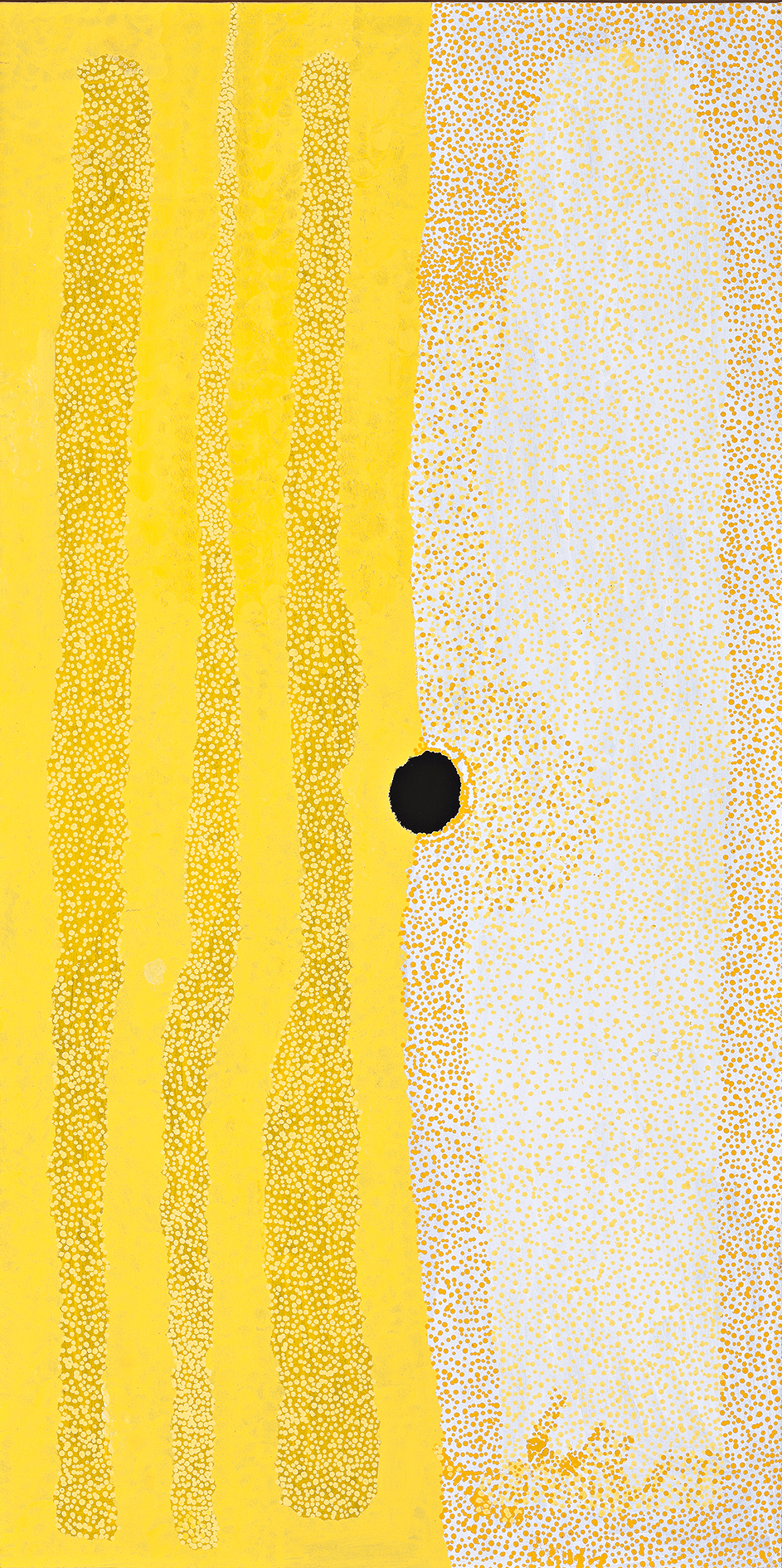 This painting is accompanied by a certificate of authenticity from Warlayirti Artists that states: ‘Christine has painted some of her mother’s country, south of Balgo, in the Great Sandy Desert. This country is named Winpurpurla after the tjurnnu (soak-water) depicted as the central circle in the painting. Winpurpurla is an inta or ‘living water’ place so it always has good water. Women often travel to Winpurpurla to collect a variety of seeds including lukarrari which is ground to make damper and kumpupatja (bush tomato). The definite lines in the painting represent the tali (sand hills) that dominate this country.’
