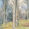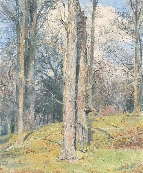 By August 1909, Tom Roberts and his family had moved to the London suburb of Hampstead Garden, within easy reach of Hampstead Heath and all the landscape opportunities it offered. Winter, England, c.1911 appears to be one so inspired. This is supported by other paintings related in subject, style and date, particularly The Copse in Winter, c.1910 (private collection). In her catalogue book to the National Gallery of Australia’s Tom Roberts exhibition of 2015, Anne Gray comments on its ‘bare skeletons of trees scoring the cloudy blue sky’ and the ‘whispery atmosphere, suggesting perhaps a touch of wind among the stiffened branches’.1 Open skies dominate The Copse in Winter, whereas Winter, England is enclosed, dominated by grey trees, pale yellows and blues. Yet, both paintings are filled with the atmosphere of winter, sharing cool sunlight and skeletal branches of trees stripped of their leaves. Moreover, a framer’s label on the verso of Winter, England, c.1911 carries both Robert’s new address, ‘Bigwood Road, Hampstead Garden Suburb’ and the date ‘1911’.