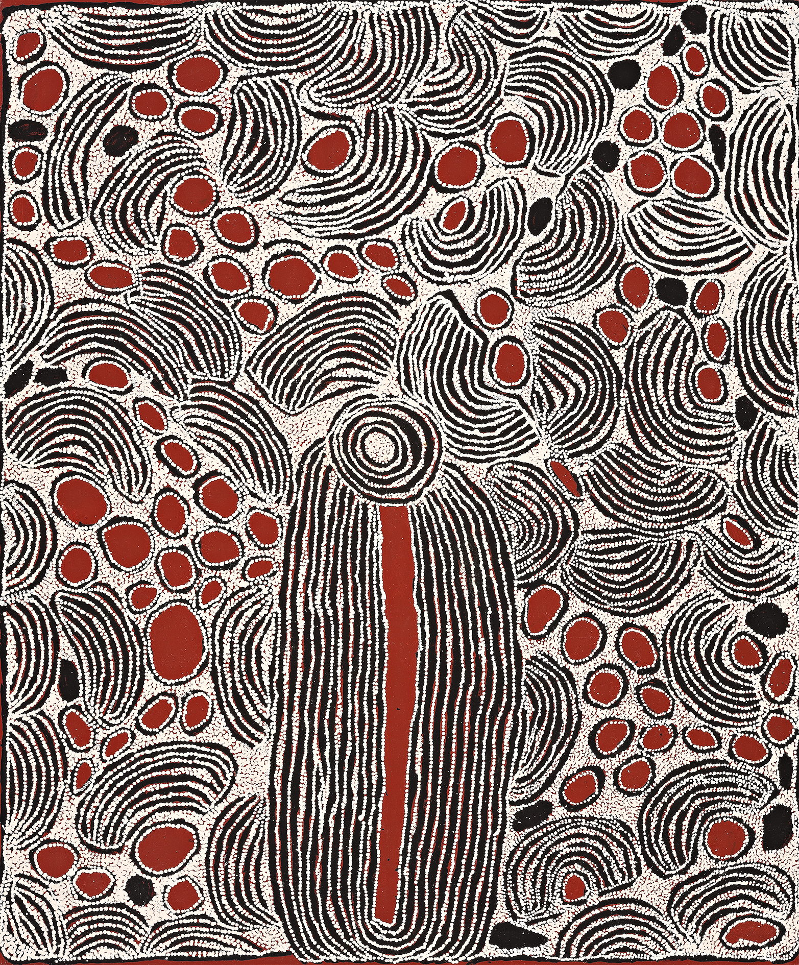 There is a poetic synergy between Ningura’s status as matriarch and the theme of her painting. Wirrulnga is a ‘birthing place’ associated with the Tingari Women who travelled to the site from Kunaputa. The central form of her painting represents the long flat platform and related waterhole, while the adjacent round objects were used by the Tingari women. The gentle arcs evoke the nyimparra (pubic cover, made with hairstring) worn by the women.