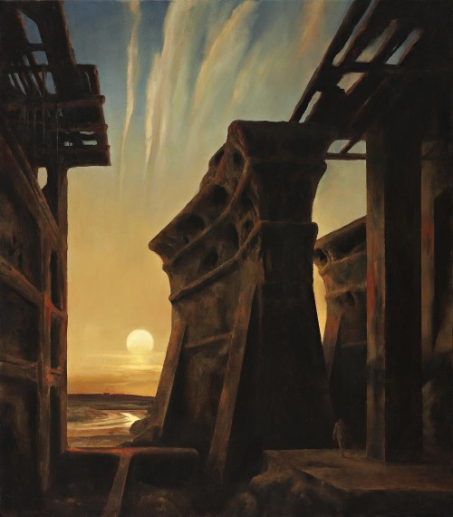As exemplified by the magnificent World of Iron, 2004, a motif frequently punctuating Amor’s landscapes is that of a large, man-made structure succumbing to the elements. Here, the great hulk of a decaying factory is silhouetted against a blazing Turneresque sunset which catches the lower reaches of a meandering river and sets aflame the streaky cirrus clouds in the evening sky. Heightening the mystery and drama of the strange construction is a tiny shadowy figure striding purposefully into the blackness of the darkened foreground. Amor seems to suggest that the world of iron is in its sunset times, its power and purpose softened and still.3 For no matter how large and well-engineered, such structures will quickly decay and corrode in the harsh elements – perhaps highlighting the folly of man’s feeble attempts to create permanence in an unstable world.