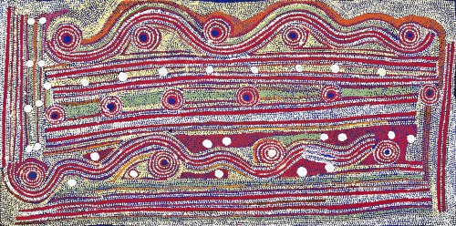 The importance of this place cannot be overemphasised as young boys are brought here to be initiated from as far as Pitjanjatjara country to the south and Lajamanu to the north. In contemporary Warlpiri paintings traditional iconography is used to represent the Tjukurrpa, particular sites and other elements. During the performance of this ceremony the men wear jinjirla (white feather headdresses) on either side of their heads. They also wear wooden carvings of stars which are also laid out on the ground as part of the sand paintings produced for business. ngalyipi (snake vine), is often depicted as long curved lines, and is used to tie Witi (ceremonial spears) vertically to the shins of the dancing initiates. These Witi are typically shown as long straight lines and the yanjirlpirri (stars) are usually depicted as white circles or roundels.’