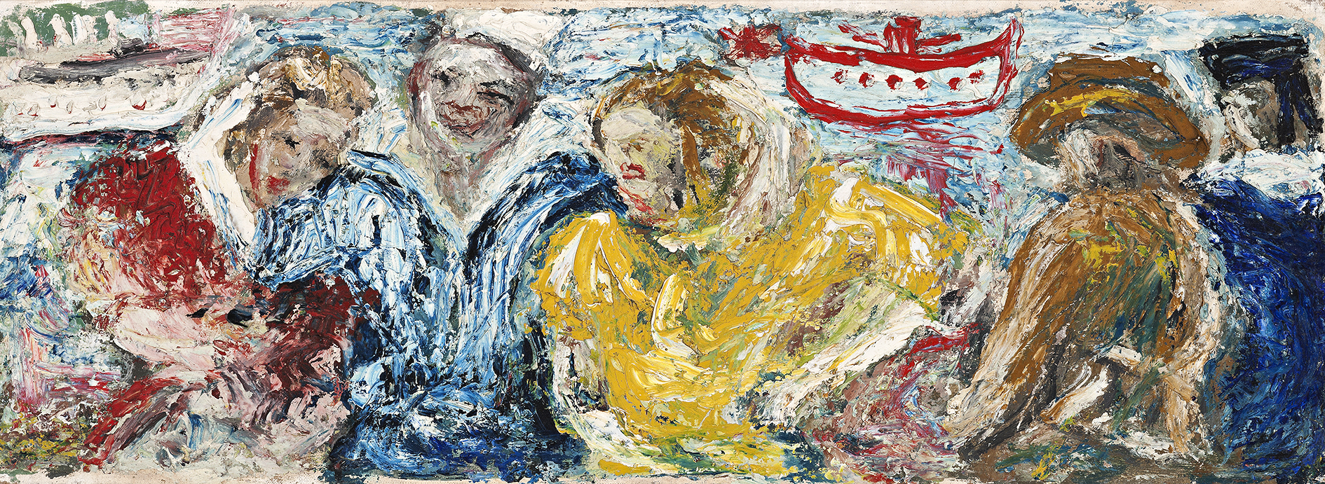 Out of this tumult comes this swirling and little known painting by Vassilieff, bristling with latent energy. Painted by the bay, an obvious assignation spot for the amorous, a buoyant US sailor has a brightly dressed girl on each arm. ‘The Americans were quite uninhibited … and had no qualms about kissing and cuddling their girls in public. It gave the city an erotic charge underscored by the closeness of death; a reckless gaiety, of pleasures taken swiftly, wantonly.’5 To the right of the happy trio stands an Australian soldier and his navy mate. Their disdain for the affair is palpable. The date of 1942 for Yankee with Girls, Aussie Without was listed in a major exhibition of Vassilieff’s works at the Macquarie Galleries in Sydney, however his biographer Felicity St John Moore cites it as 1945. Considering the flashpoint of 1942, it appears more likely that the earlier date is accurate. Due to wartime restrictions, art materials were already in scarce supply in these years and Vassilieff’s use of muslin over board to mimic the effect of canvas makes Yankee with Girls, Aussie Without stand out as an important DIY wartime relic as much as it is an expressively rendered scene by this influential Melbourne artist.