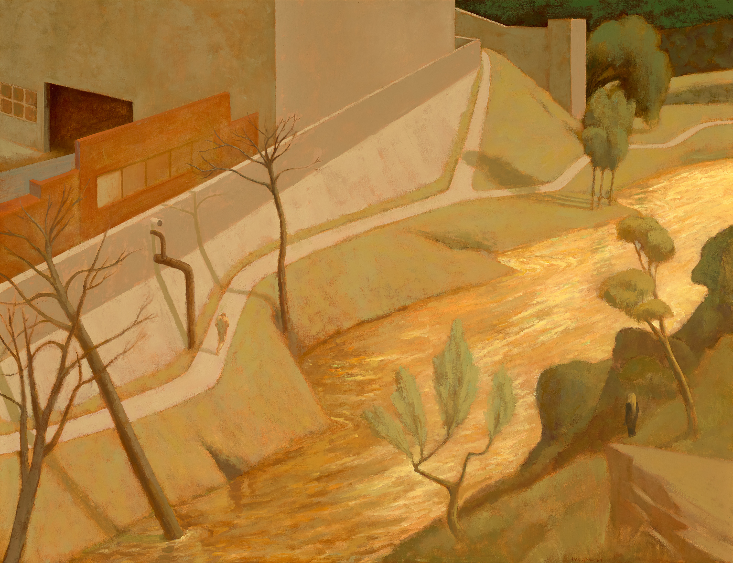 As exemplified superbly by The Yarra River at Abbotsford, 1989, a motif frequently punctuating Amor's urban landscapes is that of the solitary individual, alone and dissociated in his environment. Capturing the view from one of the extensive walking trails along the banks of the Yarra River in Abbotsford, an inner suburb of Melbourne, the scene here bears an uncanny sense of déjà vu, of something already experienced. And yet, such familiarity provides the viewer with little comfort or reassurance. To the contrary, the prevailing mood is one of impending doom – the tortured trees, incongruous now in this threatening urbanised environment, cast ominous shadows in the swirling murky waters below, while the two figures, dwarfed in scale and isolated from one another on either side of the river, intensifies the underlying surrealist drama and suspense of the work. Significantly, when discussing the closely related etching entitled Abbotsford, 1990 in the collection of the State Library of Victoria, Amor notes that such compositions were inspired by his revisiting of Otto Benesch’s book, Rembrandt as a Draughtsman (1960) which, gifted to him as a student in 1961, had prompted him to deliberately seek out landscapes reminiscent of those depicted by the Dutch Master.3