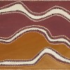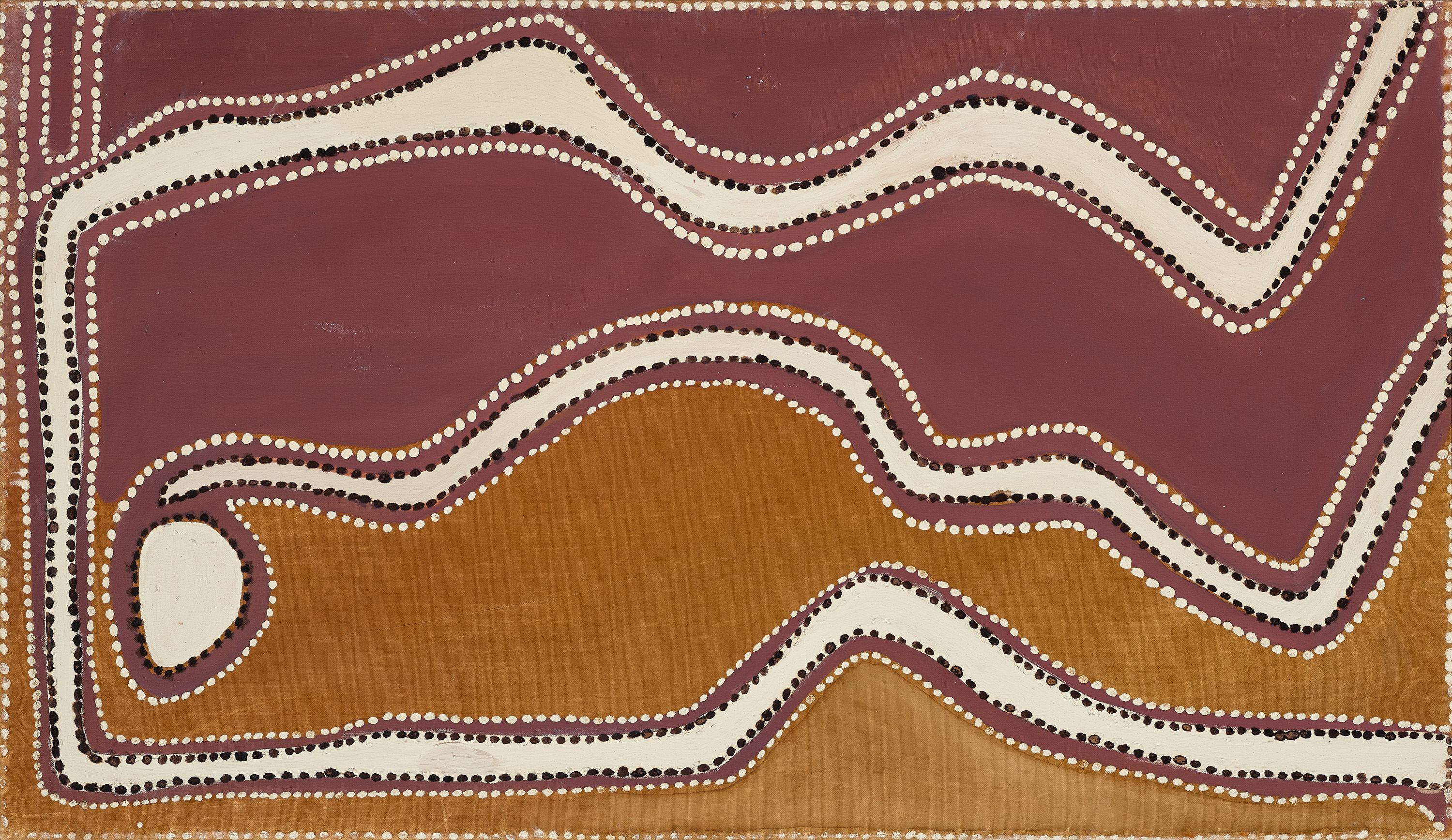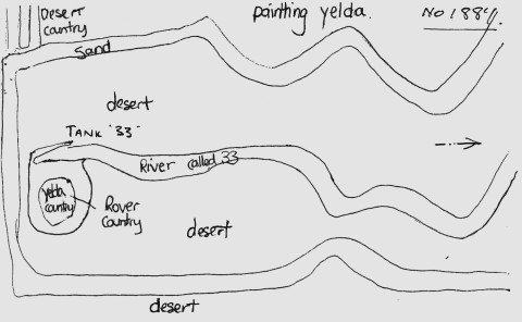0The composition of the present work is dominated by lines of white pigment and red ochre outlined in black and white dots set against a typical thinly painted but visually rich ground. The application of paint is characteristic of Rover’s gestural bravura, of his assured and intuitive genius. An annotated diagram of the painting drawn by Mary Macha, Rover Thomas’s agent and friend, indicates that the circular form in the lower left represents the soakage at Yelda (‘Rover’s country’ in the diagram) above which ‘Tank 33’ is located. The horizontal white meandering line emanating from the soak represents a river which is surrounded by a white meander that depicts sand dunes, while the red and yellow ochred ground of the canvas is described as desert country.
