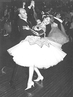 The idea for the series had been in Brack’s mind for some time. He was fascinated by the dancers, who, in his eyes, were just like the jockeys he had depicted in the Racecourse series of watercolours more than a decade earlier, ‘[turning] what should be a pastime into serious professional work’.2 For at least two years, he had been collecting visual reference material and subscribing to The Australian Dancing Times, and he planned to attend the 1967 World Ballroom Dancing Championships at Melbourne’s Festival Hall.3 Paintings including The Old Time, 1969 (Private collection, Melbourne)4, follow closely photographs of championship dancers, replicating poses, costumes, hairstyles and even the competitors’ identifying numbers. It is the striking colour palette – brilliant pinks, reds and ‘Tungsten yellow’ – however, which propels these paintings beyond the documentary and into the realm of fantasy, where gloss and artifice, and the notion of performance, prevail. The largest painting in the series, Latin American Grand Final, 1969 (National Gallery of Australia, Canberra), captures the energy and movement of its subject, the angular arms and legs, richly decorated dresses and converging floorboards, all coming together in an ambitious and dynamic composition. As was sometimes his habit, Brack included himself in this picture, a silhouetted but clearly recognisable figure whose partner is out of sight beyond the left-hand edge of the frame.