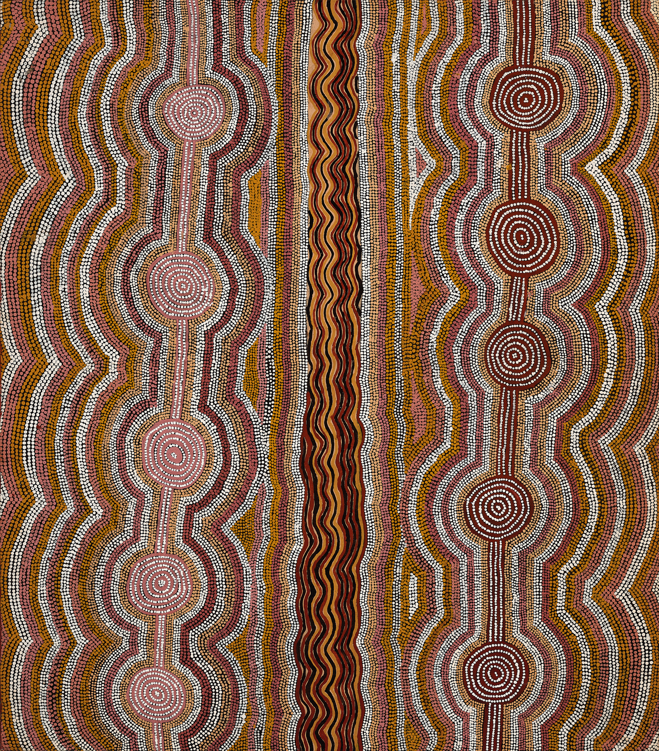 One of the original band of artists that in 1971 initiated the revolution in Australian Aboriginal desert painting at the community of Papunya, Uta Uta Tjangala was a member of the Pintupi, the last group to be brought into the government run settlement. A man of high ritual status with deep ancestral knowledge, he created some of the great masterpieces of the modern Western Desert painting movement, from his first paintings on composition board to later monumental canvases produced in the 1980s. Two early major canvas works relate to this site, the first of which, Yumari, 1981, was exhibited at the XVII Biennale de São Paulo. This painting was also shown alongside Yumari, 1983, in Dreamings: The Art of Aboriginal Australia, the major exhibition that toured through the United States and Australia in 1988 – 89. Another painting related to the site is Old Man’s Dreaming, 1983, now in the collection of the Art Gallery of South Australia, Adelaide, which was included in the exhibition Australia at the Royal Academy, London in 2013.