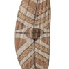 carved from the buttress root of a tropical fig tree, of elongated ovoid form, the front with raised boss and decorated with traditional designs in red, yellow, white and black pigments